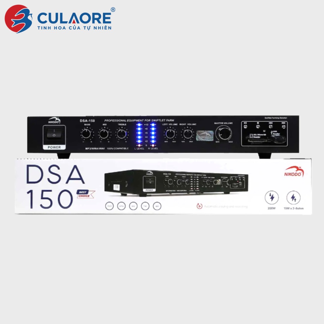 - Với công suất 30w, Amply DSA-150 có thể tải trọng đến 150 loa chim yến, phù hợp cho hệ thống loa phóng, loa cửa, hoặc loa dẫn.